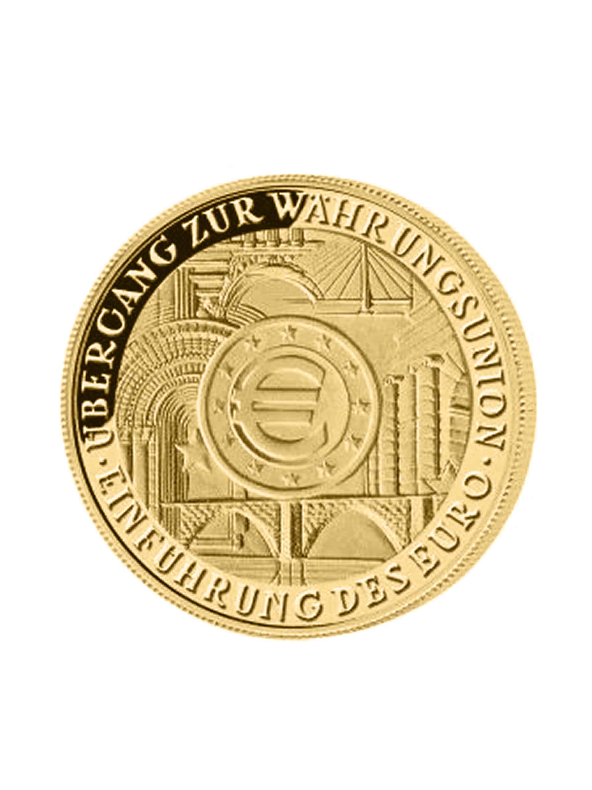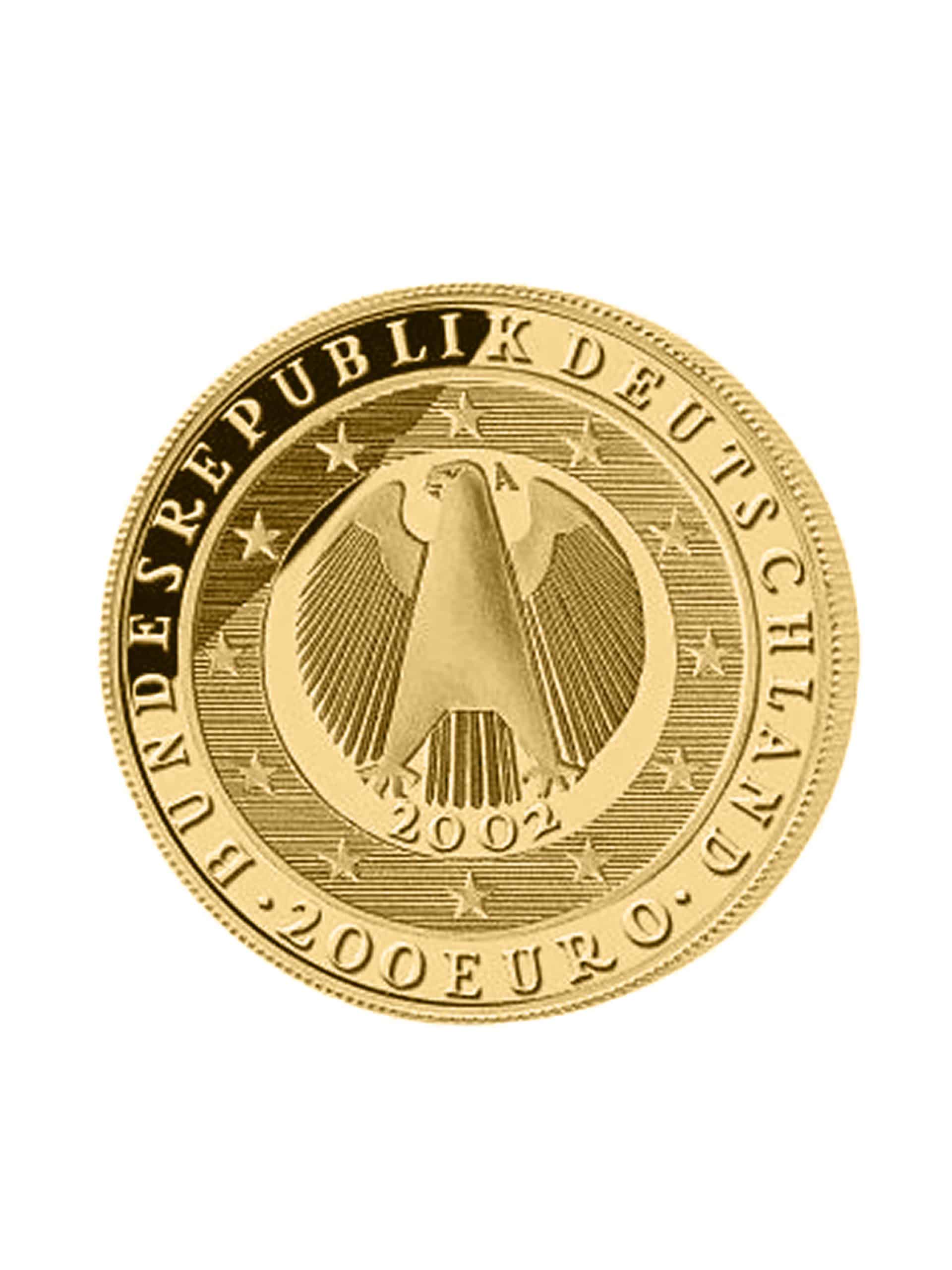 Die bisher einzige 200€ Goldmünze der Bundesrepublik Deutschland BRD wurde im Jahre 2002 zur Einführung des Euro bzw. zum Übergang zur Währungsunion als 1oz Goldmünze mit einer Auflage von 20.000 Stück je Prägestätte ausgegeben.